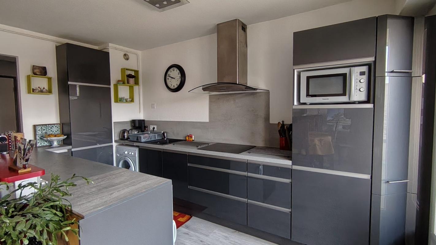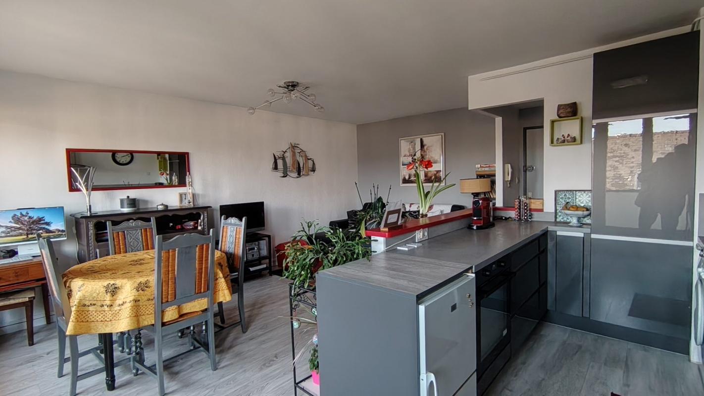 Entrée avec placard, cuisine aménagée et équipée ouverte sur le séjour (grand balcon filant), un dégagement menant vers une chambre, une salle d’eau et un w-c.